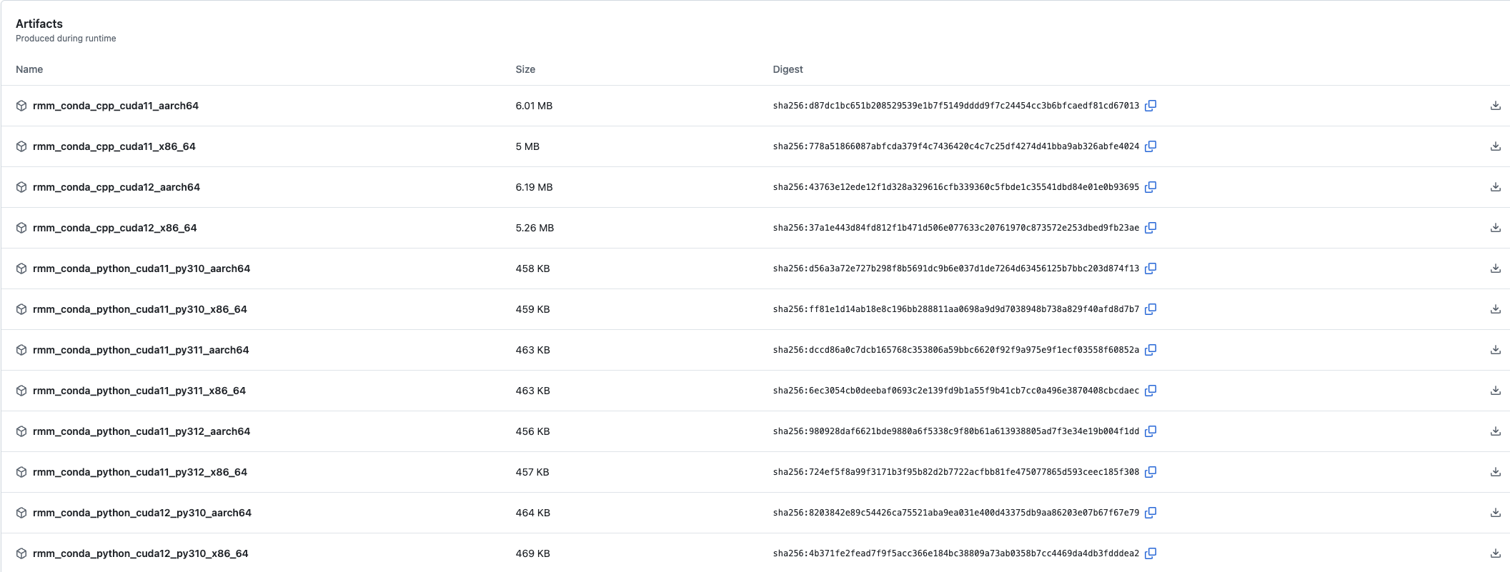 {workflow-run-id}= the unique identifier for a GitHub Actions workflow run{org}/{repo}= the repository the workflow run occurred in (e.g.rapidsai/rmm){artifact-name}= unique identifier for an artifact within one workflow run (e.g.rmm_conda_python_cuda12_py312_x86_64){destination-directory}= local directory the artifact’s contents should be decompressed to